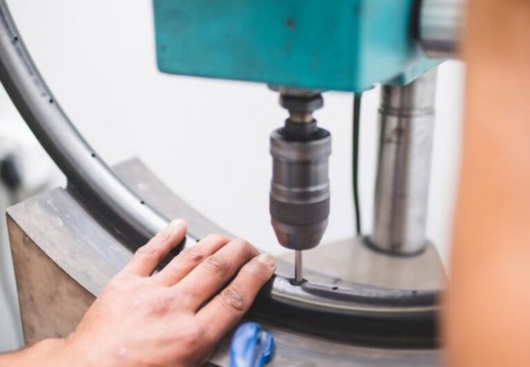 Drilling precision holes on the carbon rim using CNC machines to ensure accurate spoke and valve placement.