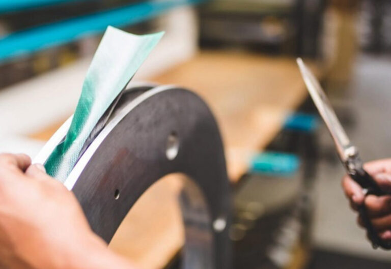 Inspecting and preparing pre-cut carbon fiber strips for rim lay-up.