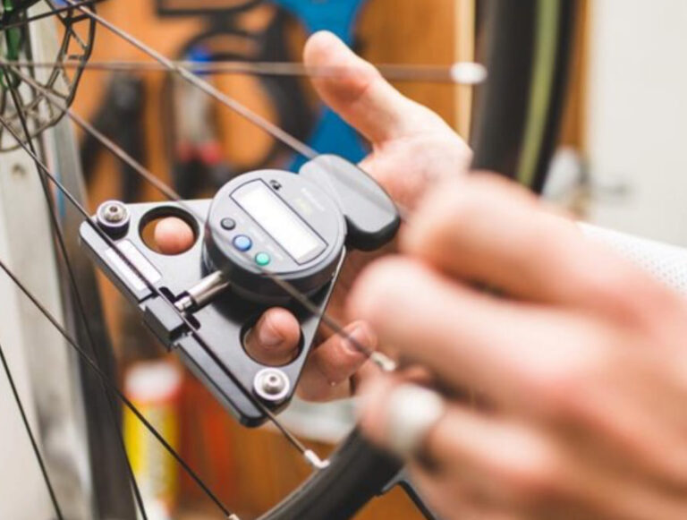 Measuring and adjusting spoke tension using a digital tension gauge to ensure balanced stress distribution, stability, and safety.